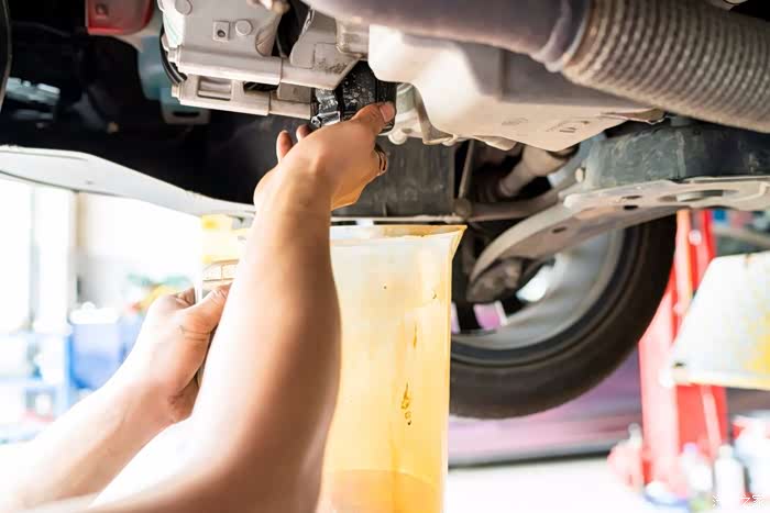 拿好容器,拧开放油螺丝,旧机油就一股脑都出来了。