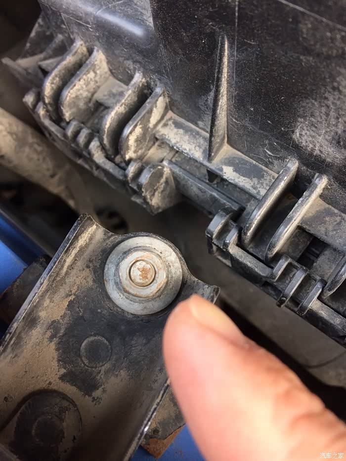 这是电瓶架的固定板螺丝,一共有2个,一个连接竖拉杆,一个连接水箱框架,只要松了两颗螺丝,拿掉电瓶支架,拆掉电瓶正负极,电瓶就可以取出和安装了