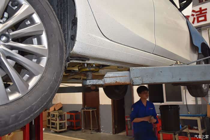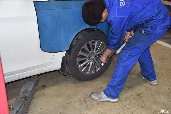顶好车的位置后,师傅在紧固轮胎螺丝