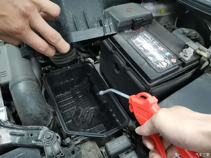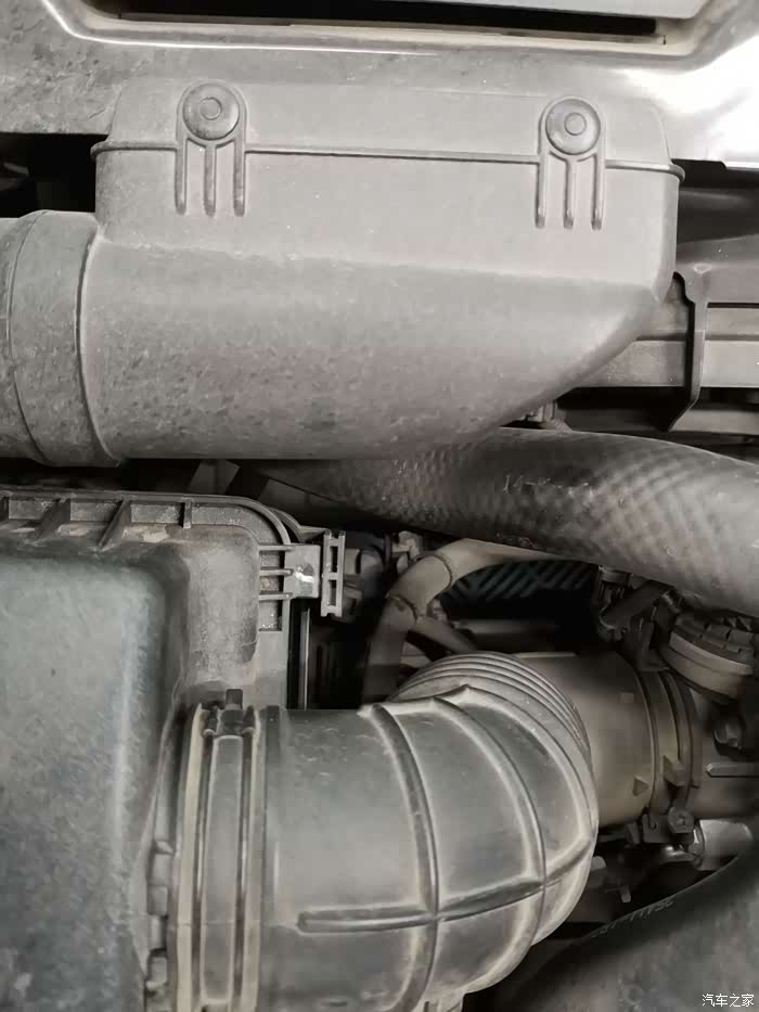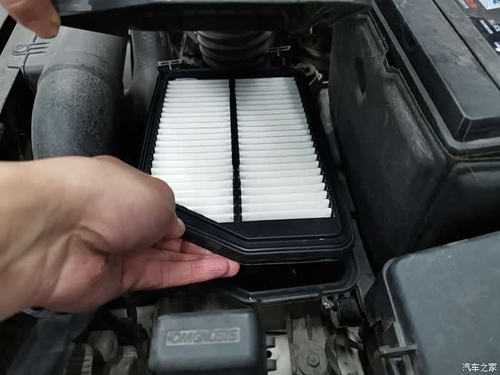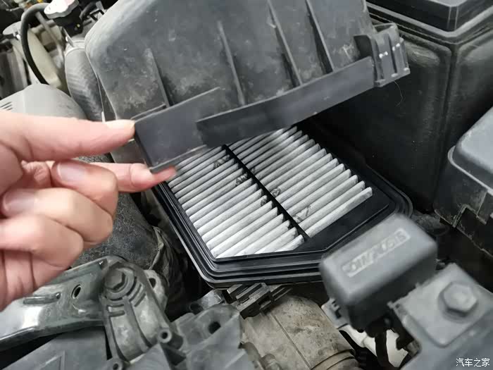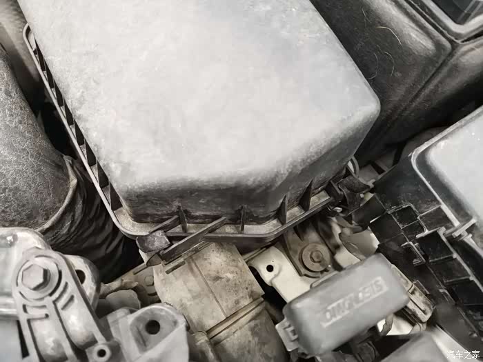这样就能打开空气滤清器的盒子和,盖子上还连接着进气管,所以无法完全拿下来,不过足以把滤清器拿出来了