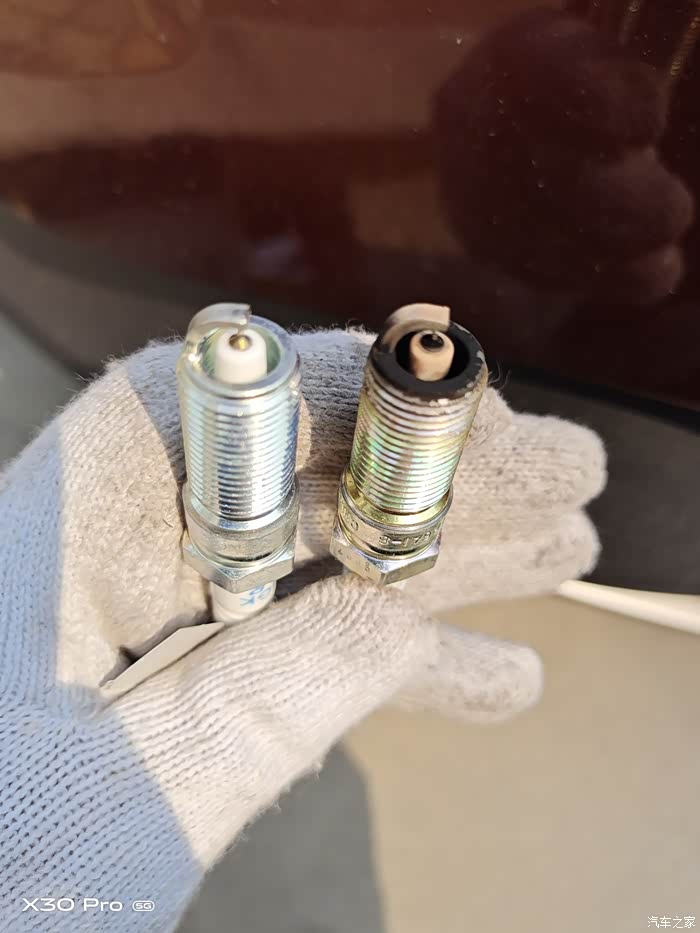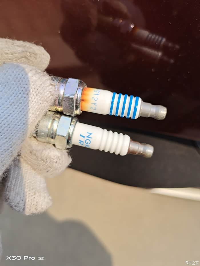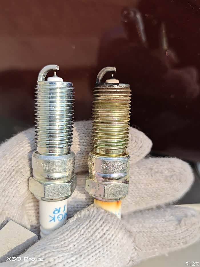 更换下来的火花塞除了发黑有点积碳,瓷和点都开始不同程度老化。平时开车加速有明显的迟钝感。