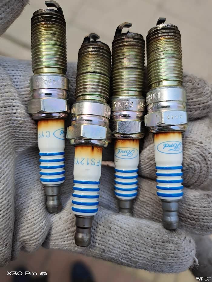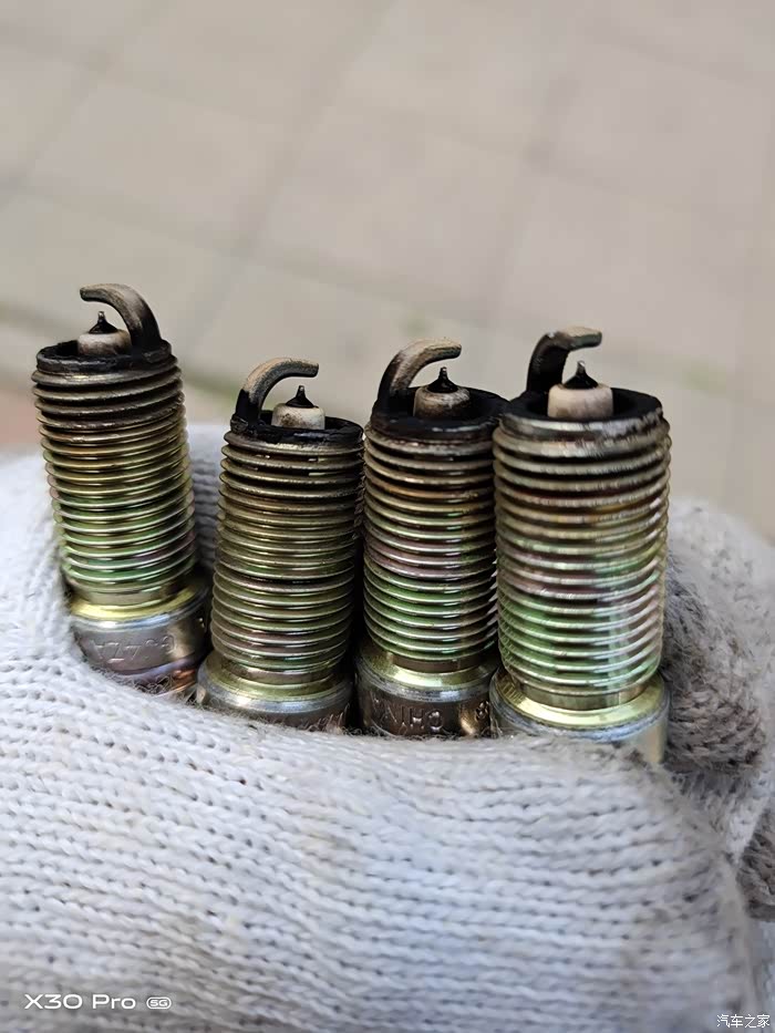 更换下来的原厂旧火花塞,建议大家3.5w-4w以内早早更换吧,换下来锈迹斑斑。