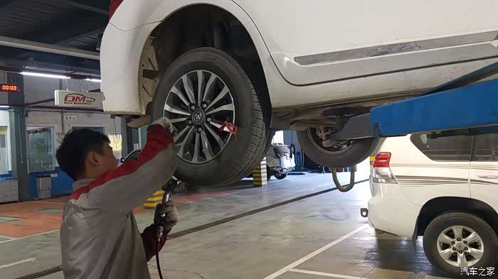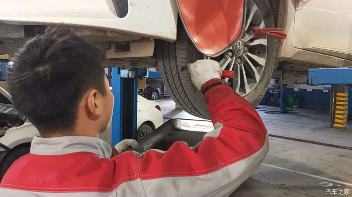 保养小哥检查四个轮子的气压