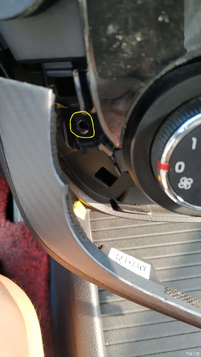 翘开后 会看到黄圈出有颗螺丝,卸下来,然后导航面板左下角这里就可以开始掰了。一点点往上掰,也不用怕的,就3个卡扣。