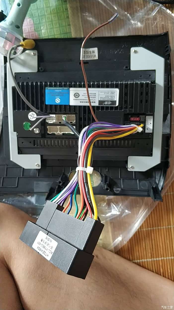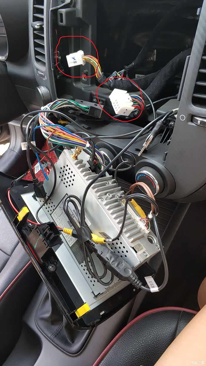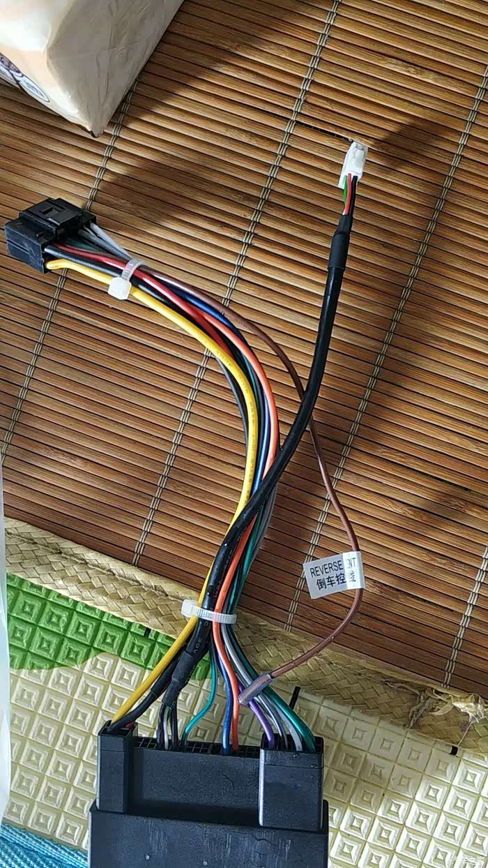 放几张新导航上的接线。后视摄像头拉过来的线有2个头,一个跟黄色那个插头对插,一个跟咖啡色的倒车控制线对接,看下图