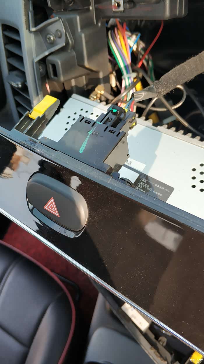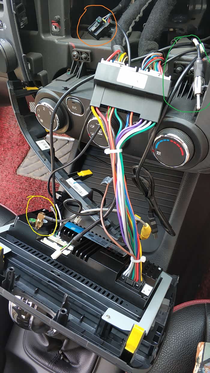先拔掉上面的插头,这是双跳灯的。再拔掉右边绿色圈里的线,这根线从右边过来的, 接导航左边的接口,不知道为什么我的天线有点短,我接好后装回去的时候一扯插头就掉出来了,害我又重新拆。左下黄色圈里的是gps天线,因为我只是屏幕坏了,所以gps模块没换,还是用原来的。