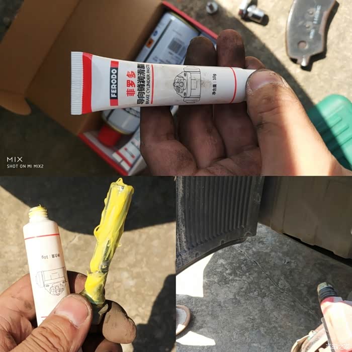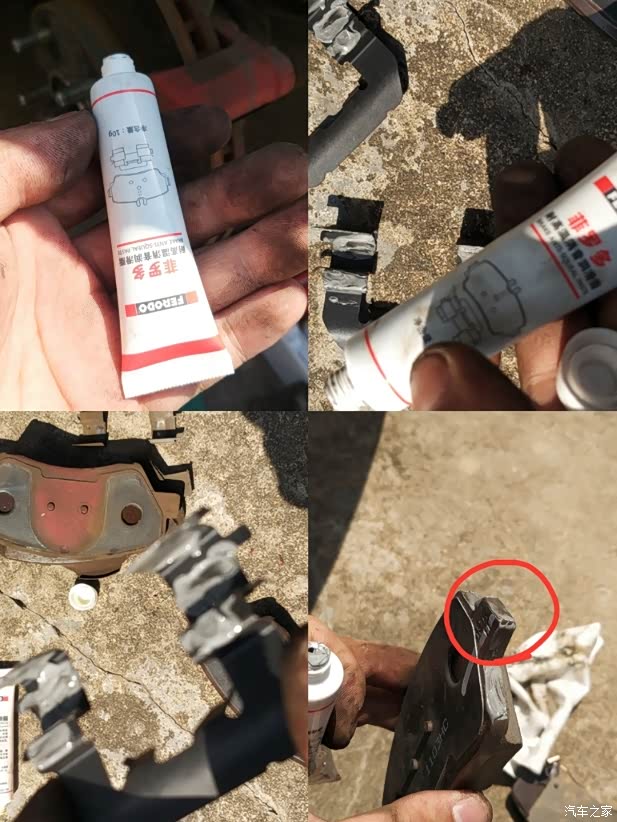 记得装新的导向垫片之前…在垫片上和刹车片两个耳朵上都抹上一些高温消音润滑脂(让新刹车片两个“耳朵”磨合的更快,起到消音润滑的作用)很多车换完刹车片后的异响就是因为没有抹这个油脂(也可用铜基润滑脂
