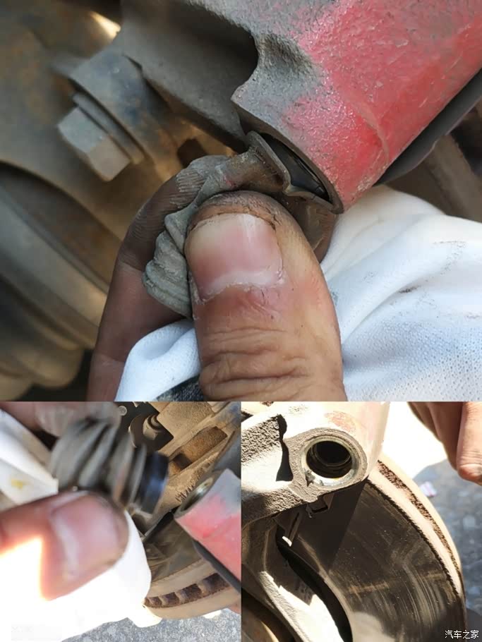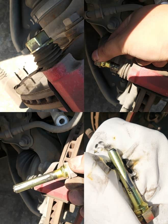 接着我们开始保养上面所说道的导向销…轻轻拔出导向销(里面的油脂基本都快没了,黑黑的)拿布擦干净…(1个分泵油两个导向销)