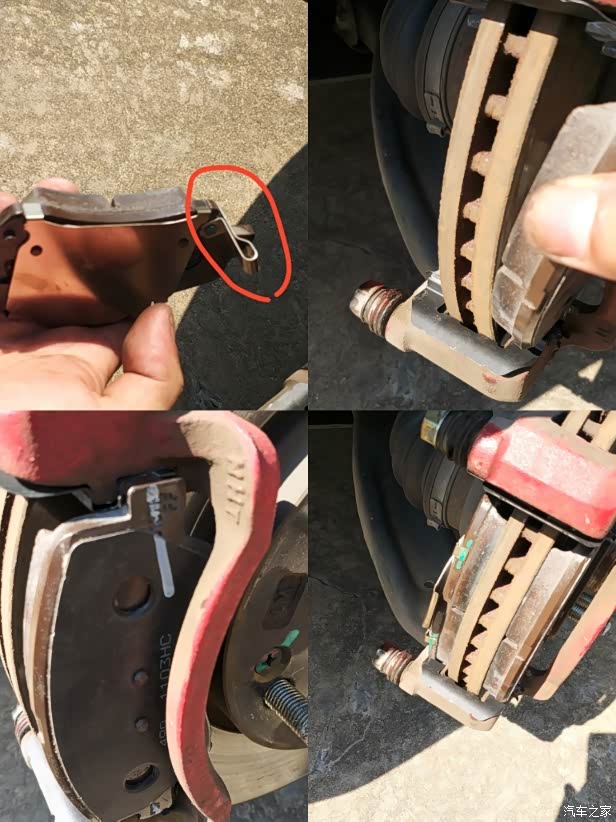 涂完消音脂以后…把新的刹车片往里卡装上…(切忌将图中红圈画出来的报警弹片的刹车片装在刹车卡钳内侧)