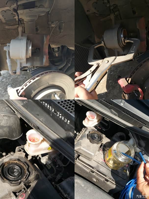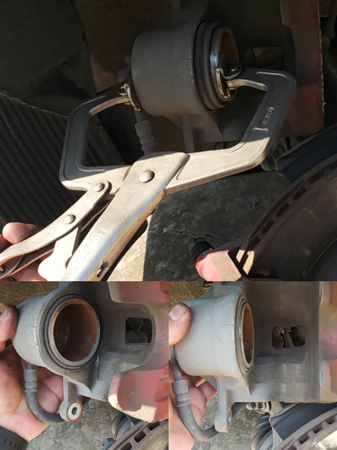 还记得我们用扎带吊着的刹车分泵么…我们要用C型大力钳把刹车泵给压回去…(在压回分泵时,随时注意刹车油液位置,不能让它溢出来…对车漆有腐蚀)