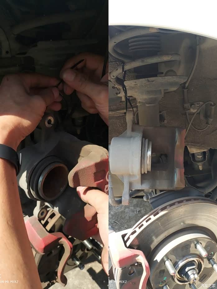 拔出刹车分泵后用扎带固定在减震器上(切记不能直接让它悬着!!!刹车油管支撑不住分泵的重量)