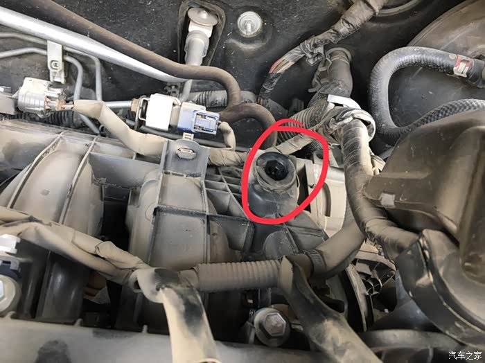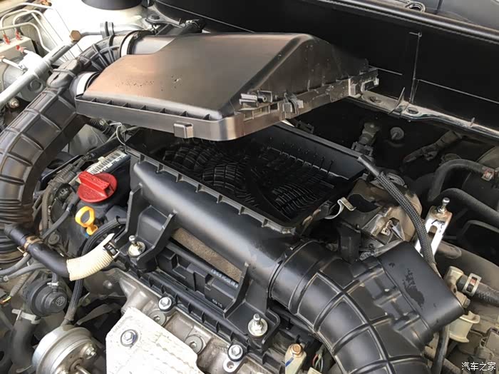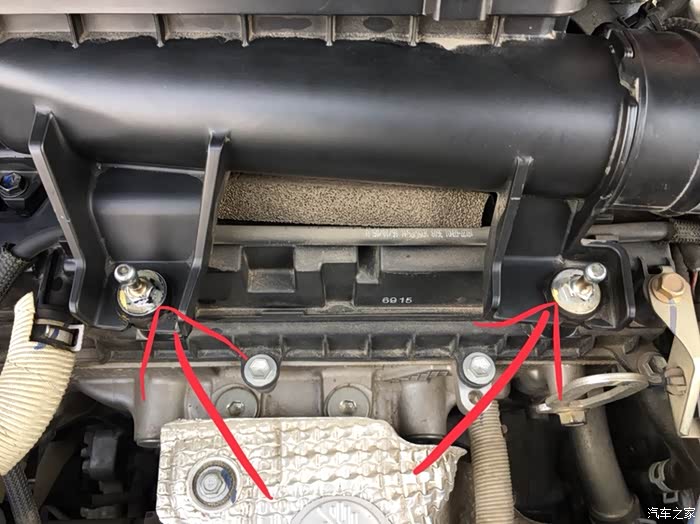拔出空气滤盒,注意是拔。空气滤盒一共有四固定点,如图四处。除了前面两颗长螺丝以外,后端的固定方式是拔拆活塞,类似于发动机隔音罩的固定方式,所以,不用担心,“拔”就好了。