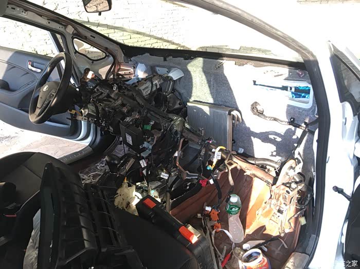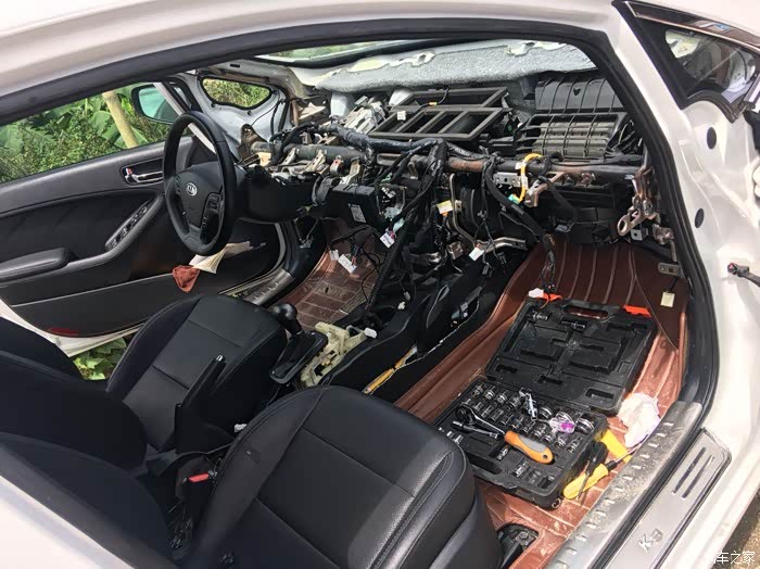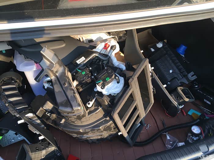 空调突然不制冷,马上打压15个检查,表果然少压了,用洗洁精泡沫检查整个空调管路包括散热器,都没有泄漏,不服,又网上买了荧光油检查,还是没有效果,多半确定是蒸发芯漏了,打电话问4S,报价是拆中控998,蒸发芯1598,真的接受不了,好吧,自己动手,图片有点乱啊。