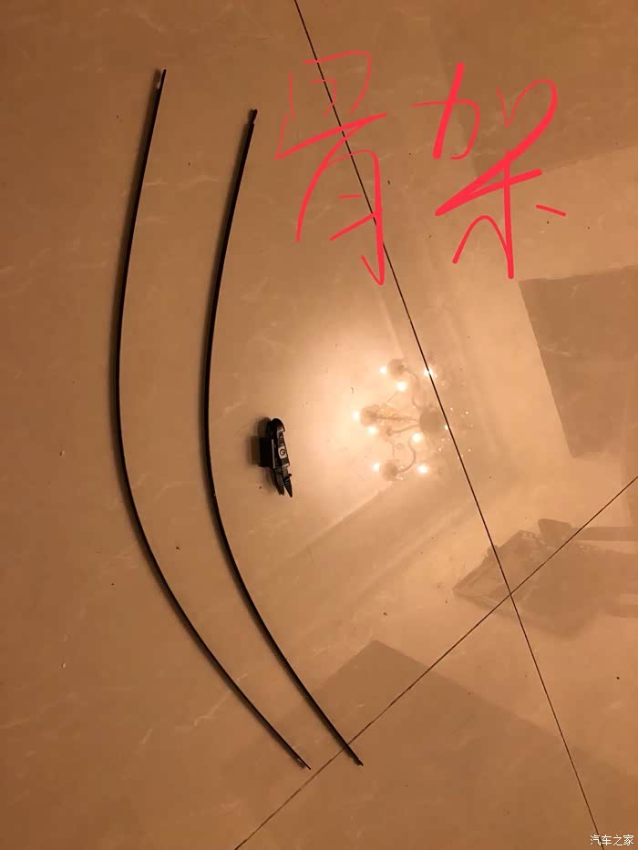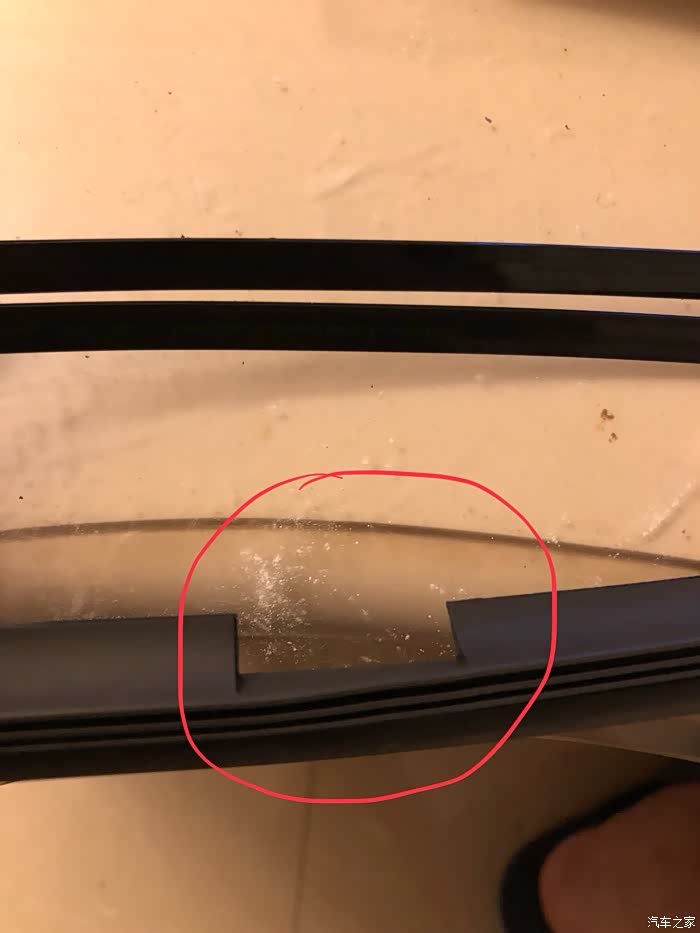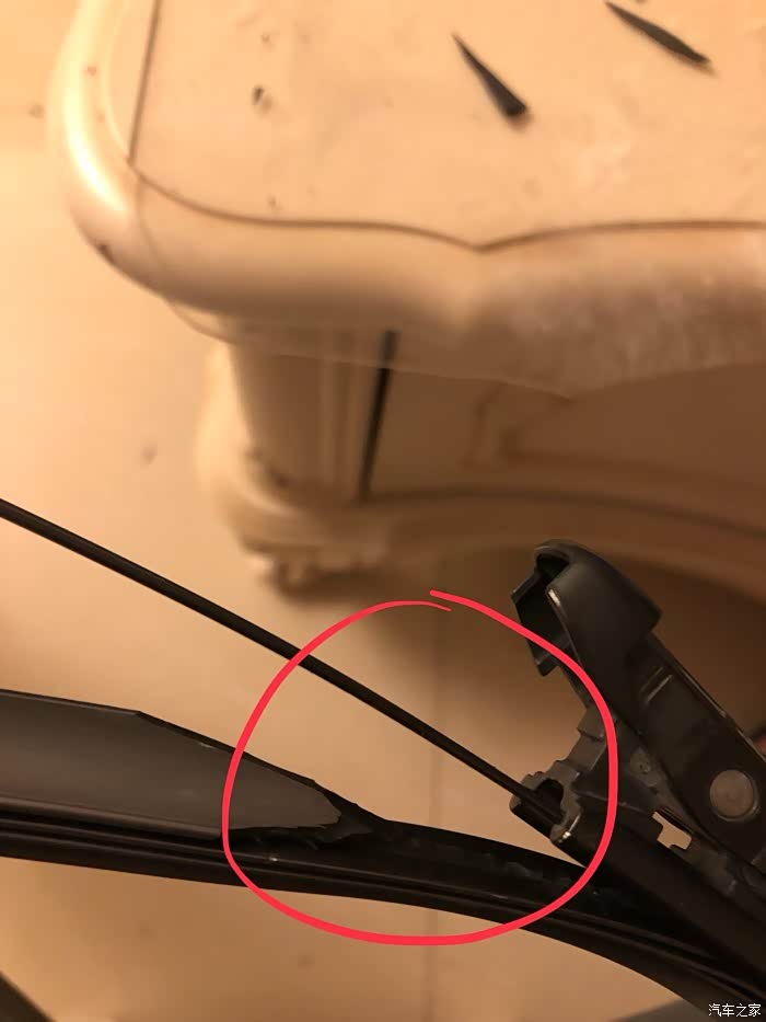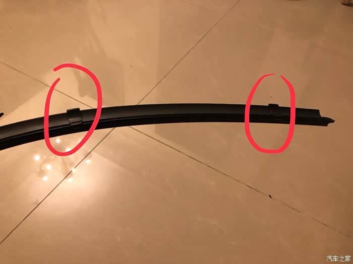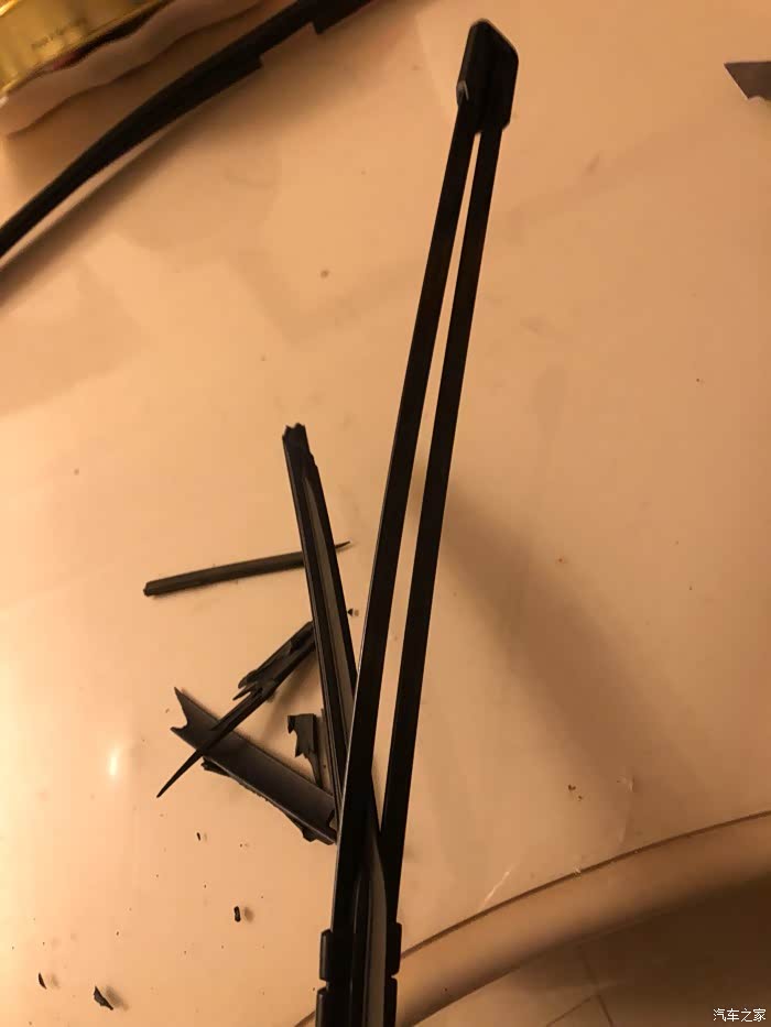 图4:一端老胶条被从骨架上取出。骨架是指那两根长长的铁条。我平时保养的还好,雨刮两年没换,平时还能刮干净,但拆的时候发现胶条确实已经老化变脆。