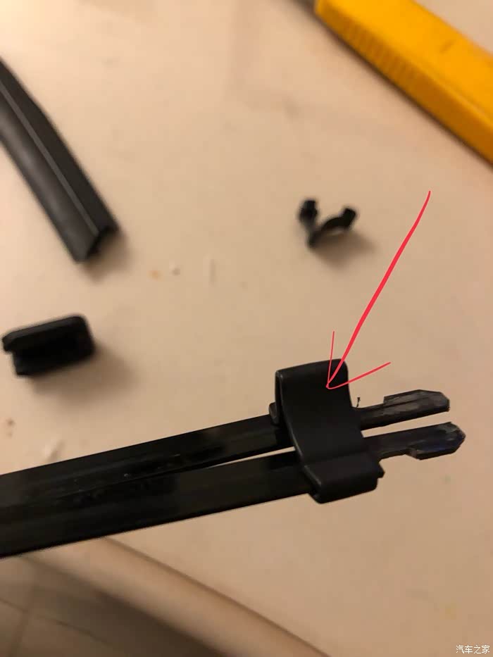 图3:拆下原胶条。雨刮两端是一样的结构,以一端为例。用小刀将原胶条划开,方法可以简单粗暴。