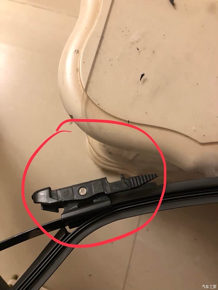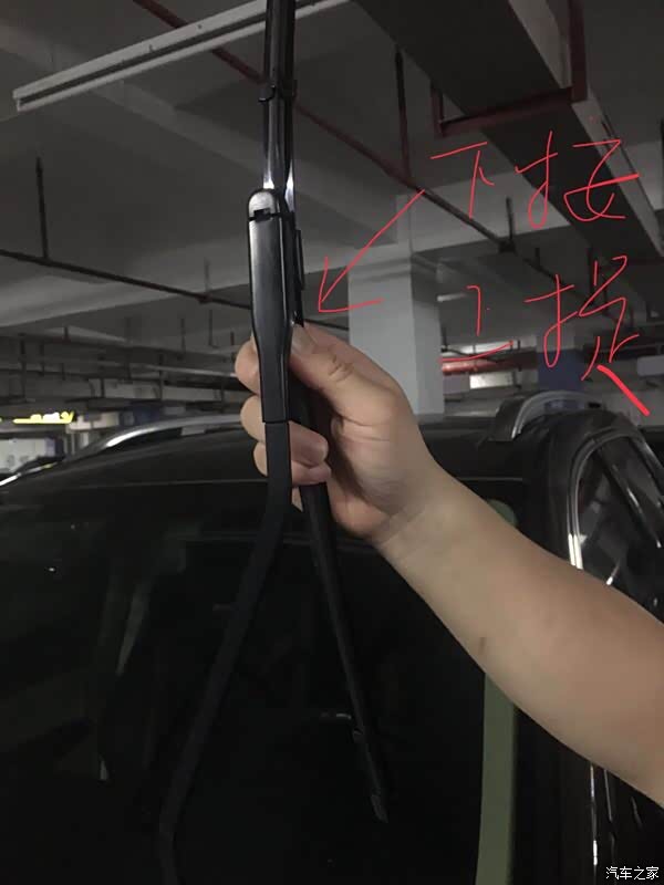 图1:取下雨刮。锐界的雨刮取下很简单,将雨刮立起来,用手按下按钮,往上一提,就可以取下雨刮。过程中可以在下方前挡玻璃上放一块布,防止雨刮不小心落下打伤玻璃。