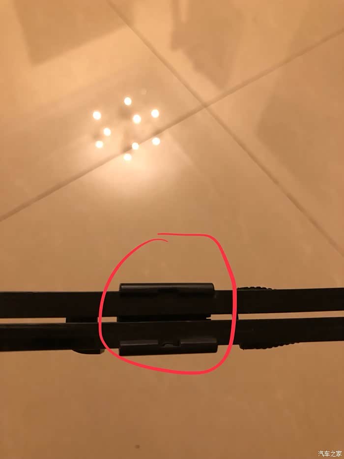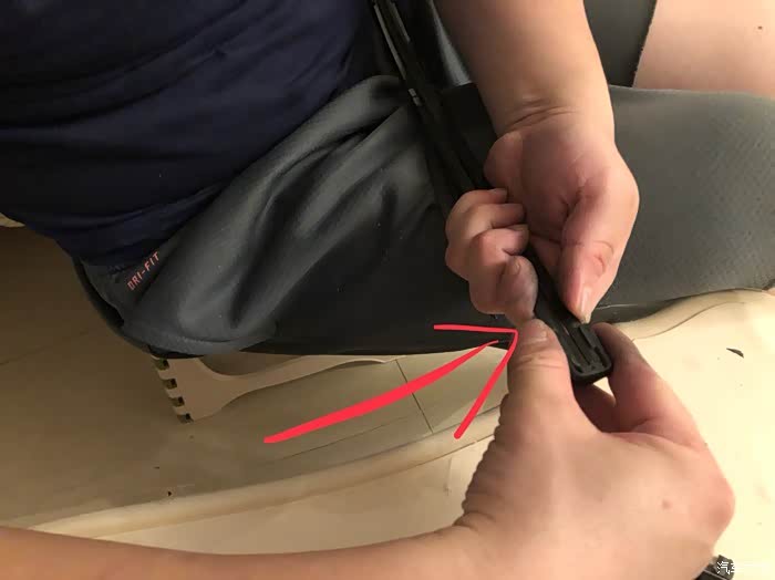 图15:最后将端头的扣子装上。左手用力按紧骨架铁条,右手将端头扣子推入,可叁考另一副雨刮查看扣子和铁条的匹配关系。