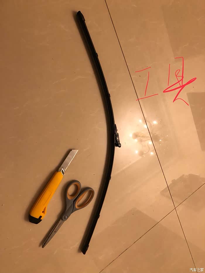 图2:工具。取下的原雨刮,工具刀,新雨刮条没在图中