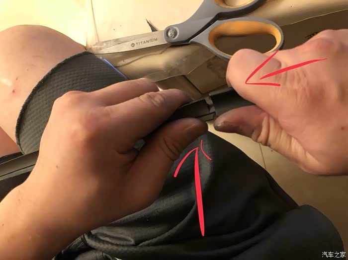 图12:由于胶条一侧已经装好,剩下的这一侧可操作性更小,我的办法是这一侧去掉更多的橡胶材料,直到能装进骨架里。忘了提一句,骨架和胶条的匹配可以参考你拆下来的另一副雨刮。