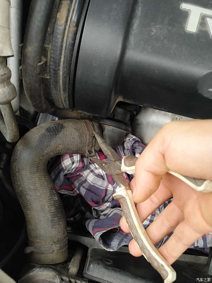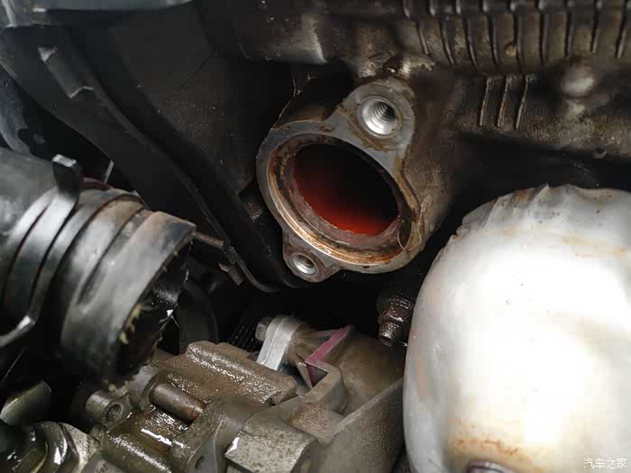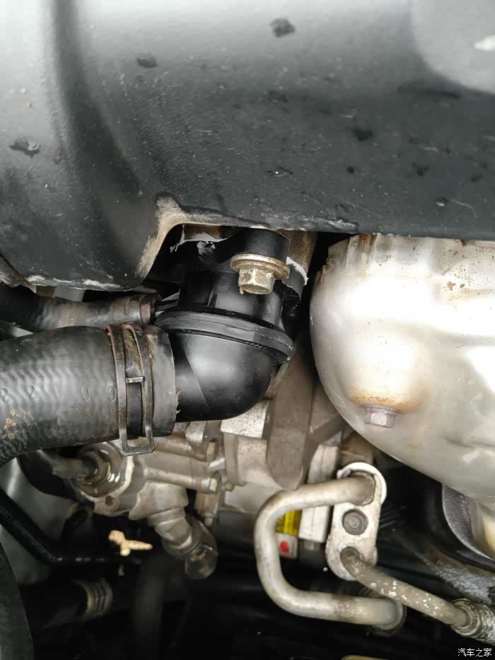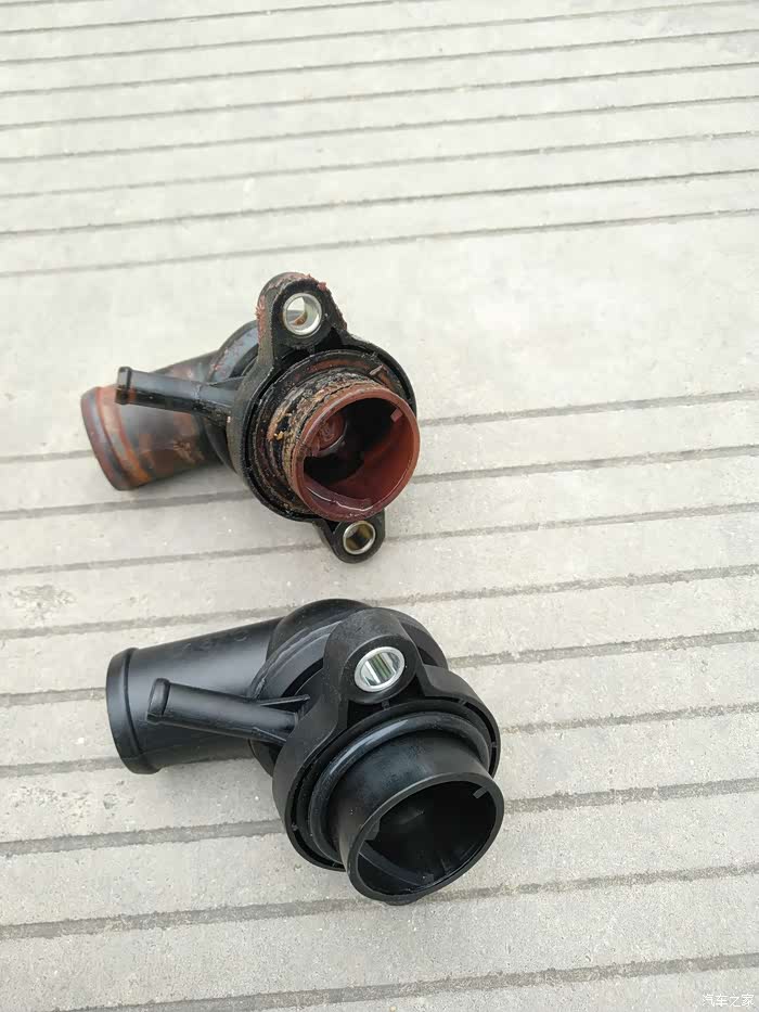 节温器三通管上面都是流出来的防冻液。本来想买铝合金的,但店家说要把螺丝边缘磨掉才能装,想想还是算了,没有那工具。
