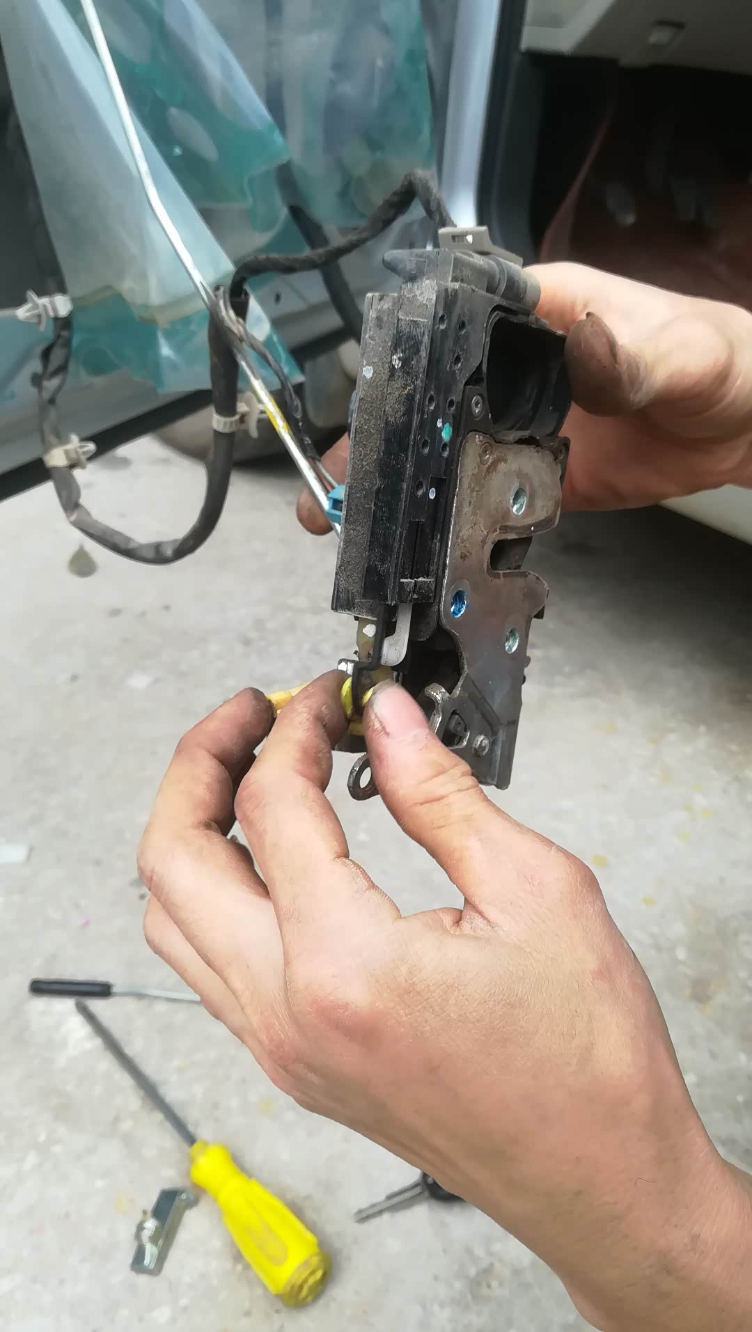 事件起因是主驾驶中控锁时灵时不灵,还可以用钥匙开,就将就用了一个多月,早几天突然拉手底座金属接口断裂,就彻底无语了,有钥匙也无法打开门。好在当时天热,副驾驶留了一点缝,好不容易打开副驾驶,找寻原因,上网买了主驾驶中控锁总成和拉手底座。今天换上,心里石头落了地。