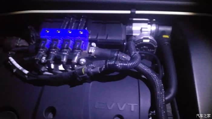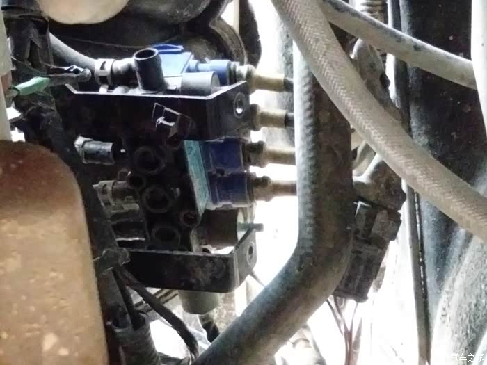 最后安装完毕的效果图,因为我把线束插头的位置改动了一下,和喷射管的朝向成了同一方向,所以看起来要比原车的显得整洁一点点,为了防止支架晃动,特地在支架下面塞进去了一截软管,起到缓冲作用!这都是过来人开心小悠的经验,不然喷轨很容易晃动,时间长了管子和支架都受不了!