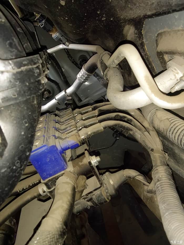 这是在车底拍的,可以看到支架已经变形,喷轨已经从安装位上下来了,即便是这样,喷轨和进气支管之间还有喷射管链接,需要拆下来才能拿下喷轨。