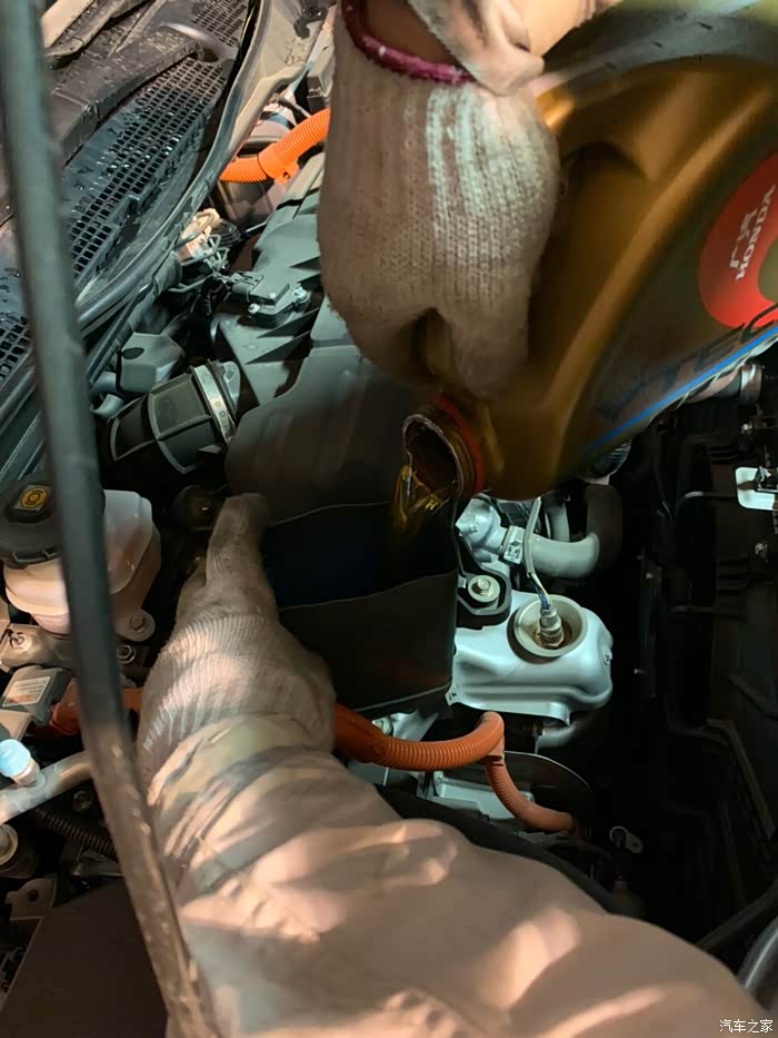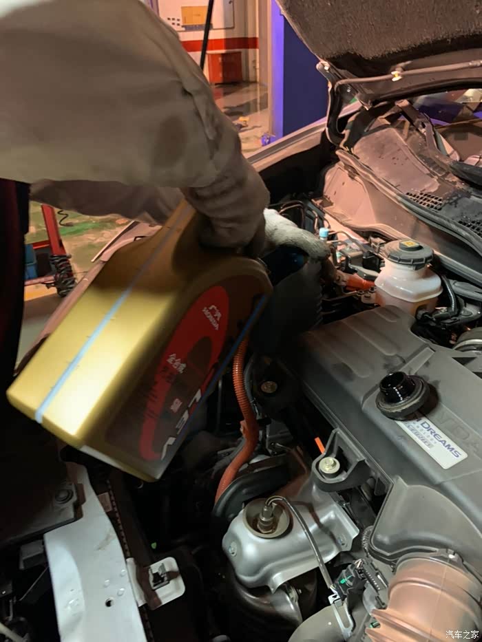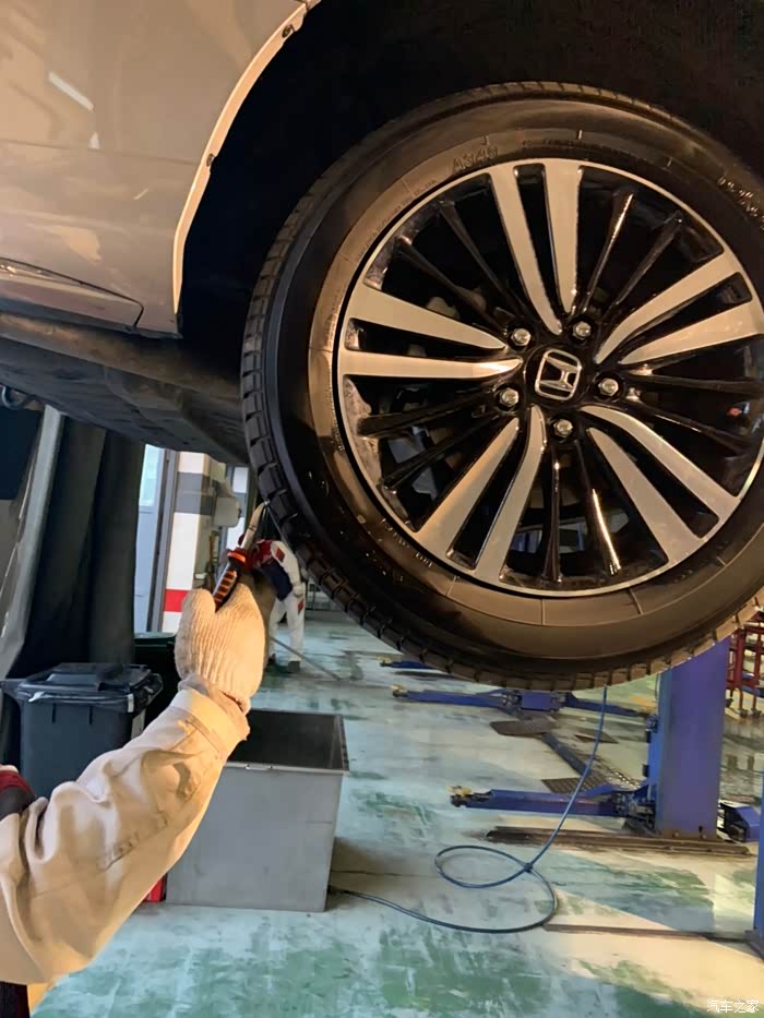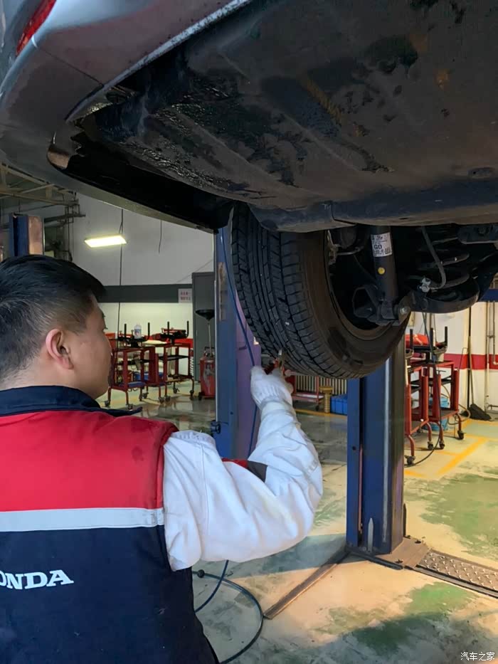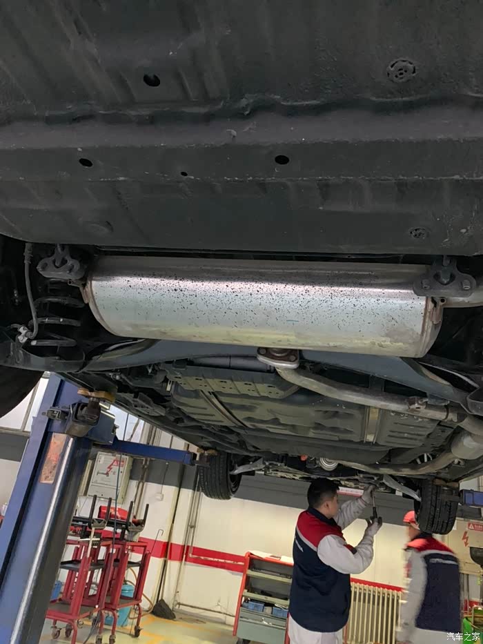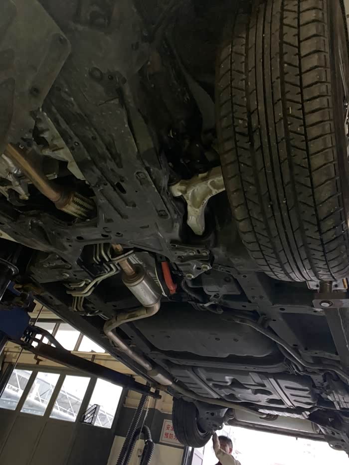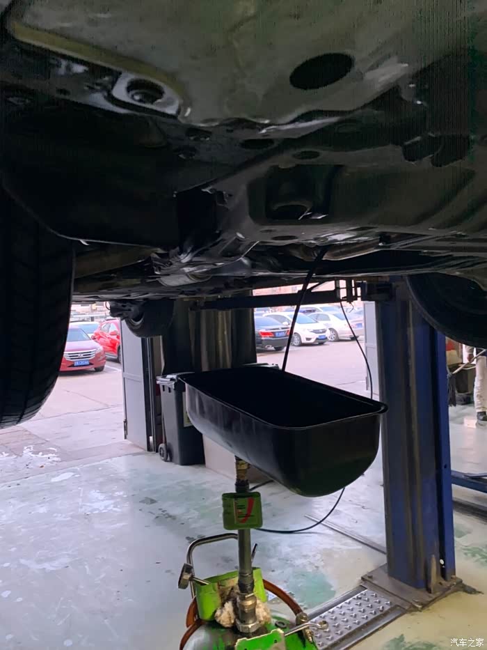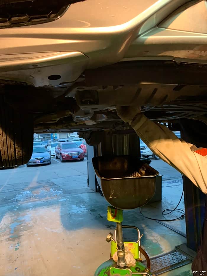 这是第二次保养,每天开车只看小公里数,总公里数一直没关注,没想到超出了3000多公里,吓得我是一身冷汗,因为第一次用的是矿物油!下午四点半到店,真的不敢再拖了,本来接待都不想接了,马上就要下班了,我一说超了3000公里,还是接了。看车、填单子、车间来人开车,所有流程十分钟走完。快修师傅将车子开上升降架,开始换机油。