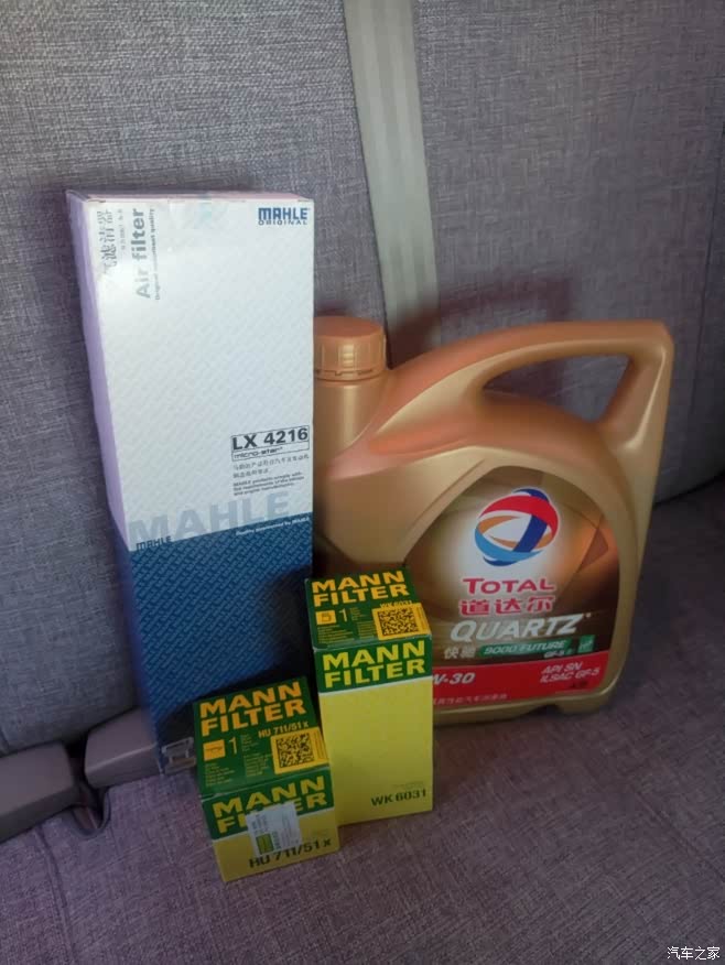 从京东买的道达尔9000,曼牌的机油滤,燃油滤清器,以及马勒的空气滤。一直用的道达尔9000,以及曼牌的滤,油门轻,响应快,发动机声音也小。