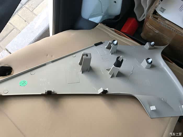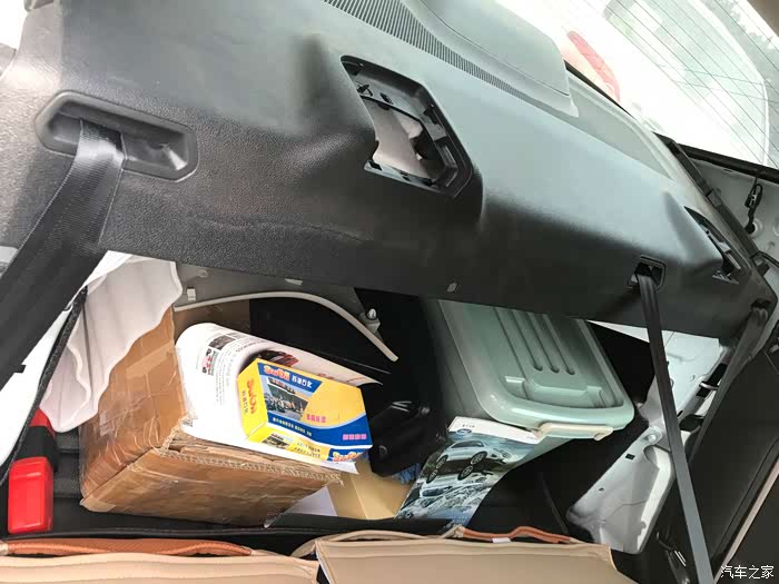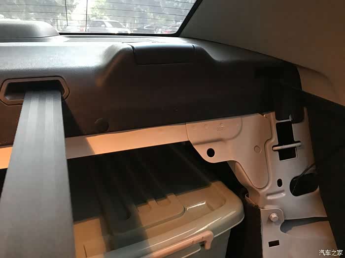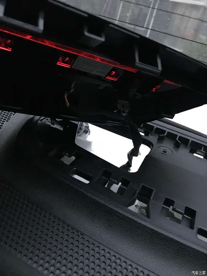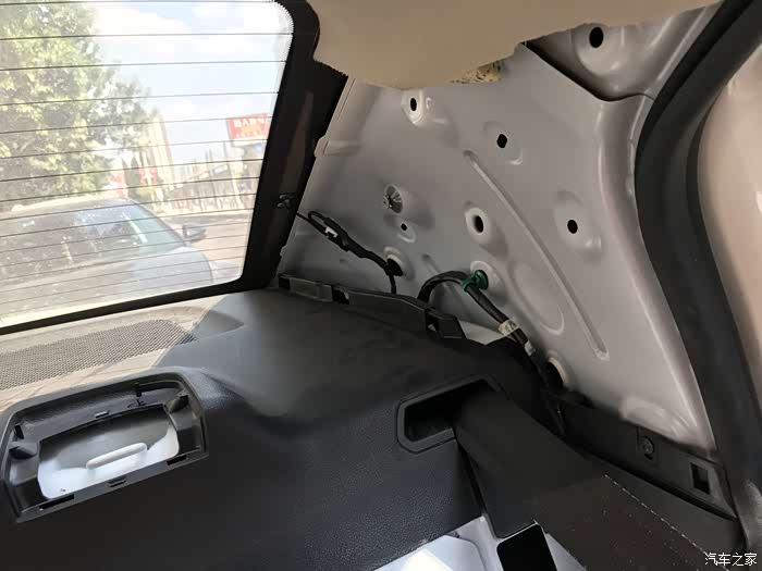 打开后盖板之后17款的刹车灯线是固定起来的,弄不掉[能从灯上拔掉。依然固定于塑料盖子上。],打开后盖时小心硬拉刹车灯线[不够挺结实不用力拽没事的],所以只能带着刹车灯拆音响了。只有一部分刚刚够拆音响的空间。
