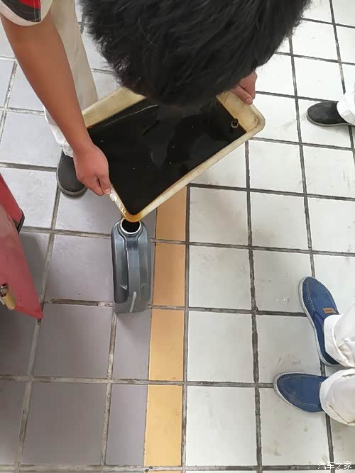 加注完毕,师傅说平时5桶,要打开油面螺丝看看是否加注足够!结果加注3.8L,打开螺丝又流出0.2多,马上让我阻止了!本身加的就比放的少了,还流出那么多!我也是醉了。