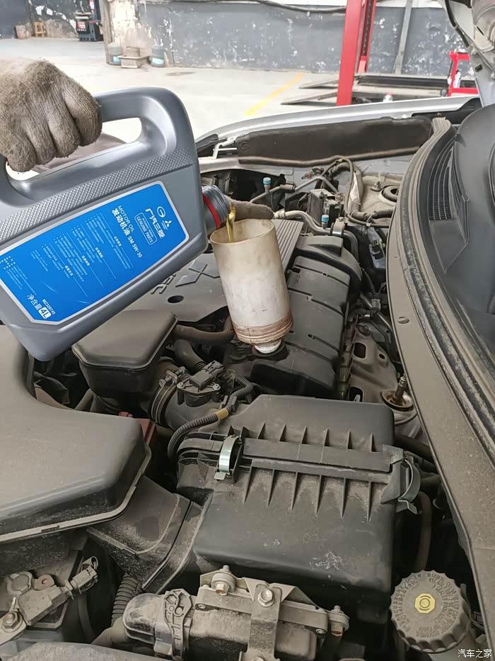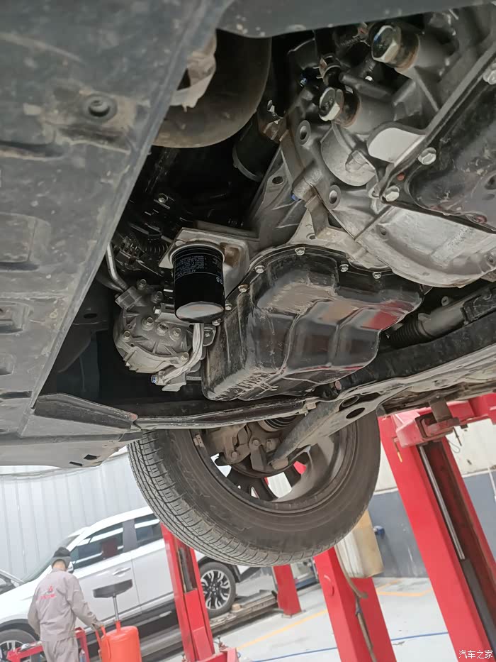 虽然有前机盖的保护,但是发动机舱里面仍然是被尘土覆盖了一层,小哥在更换完了机油。