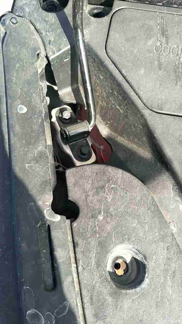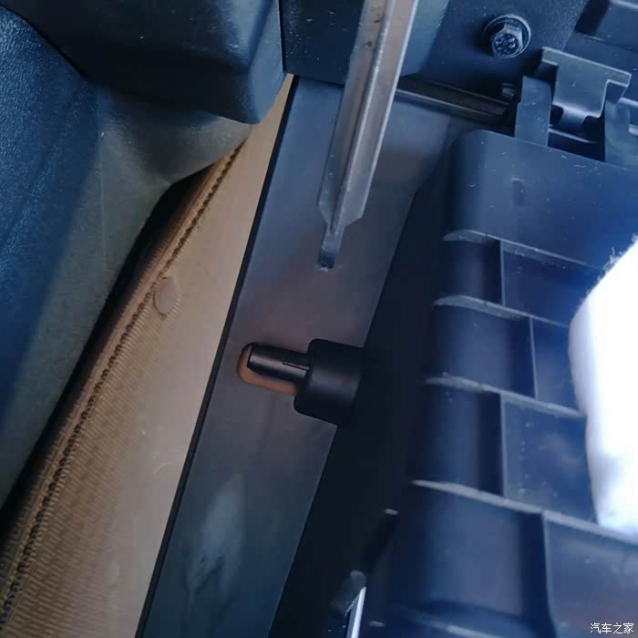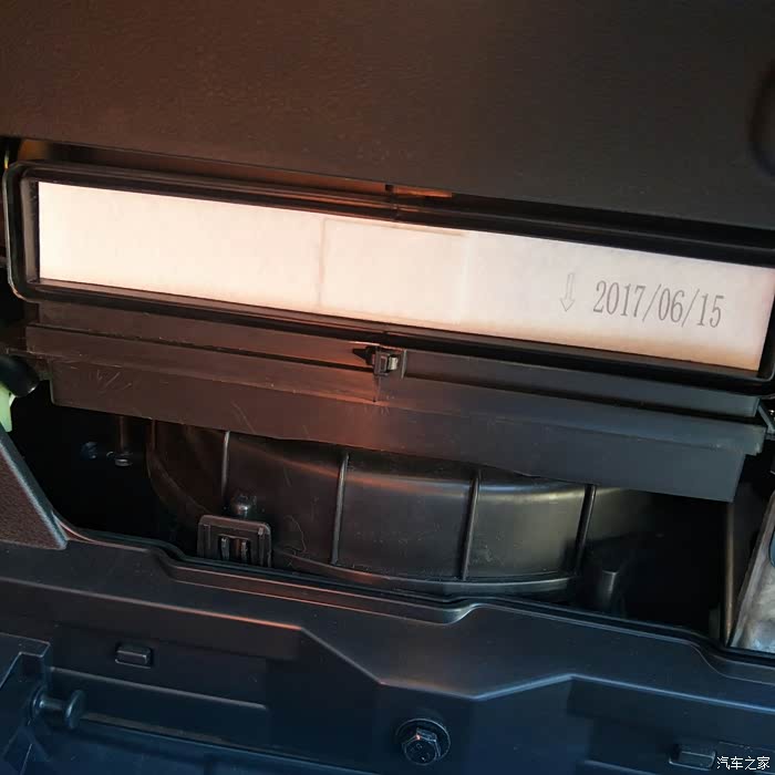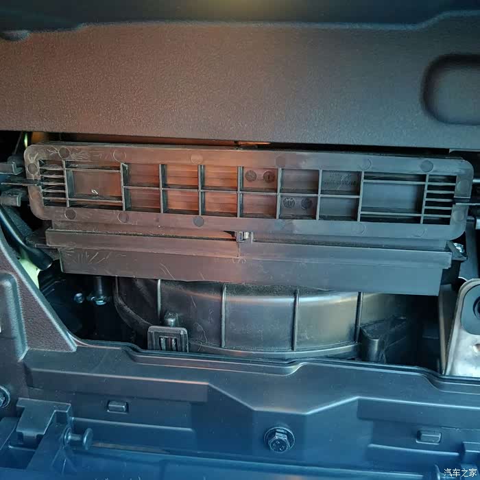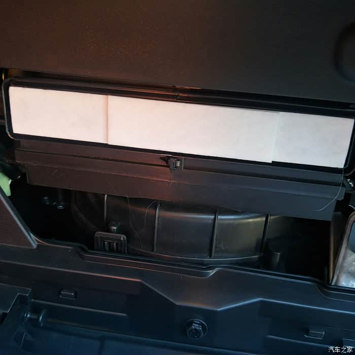 空调滤芯在储物盒里,这是卡扣,向内扣,可以扣掉,扣的时候储物盒向里推下