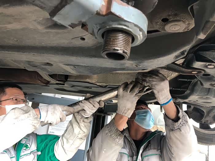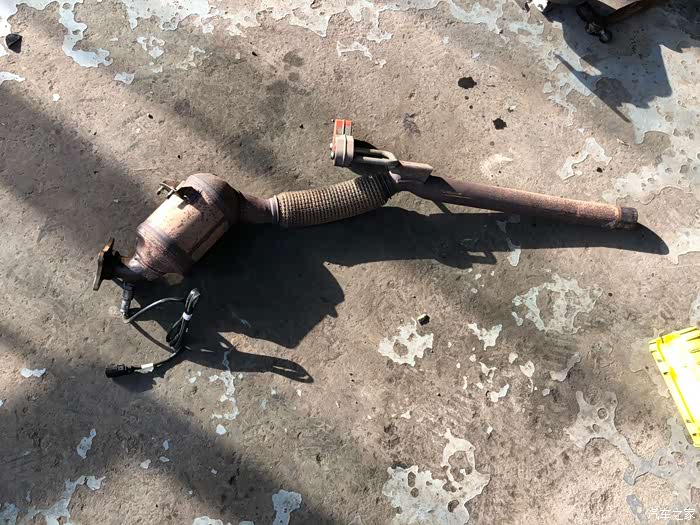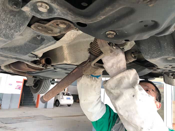 负责维修的师傅很熟练地就把旧三元催化器拆了下来,这就是造成加速无力的罪魁祸首,赶在检车前换掉,万无一失。