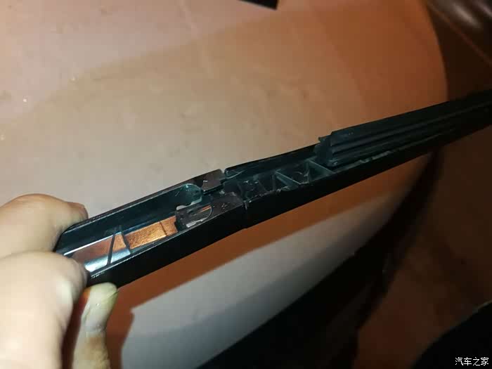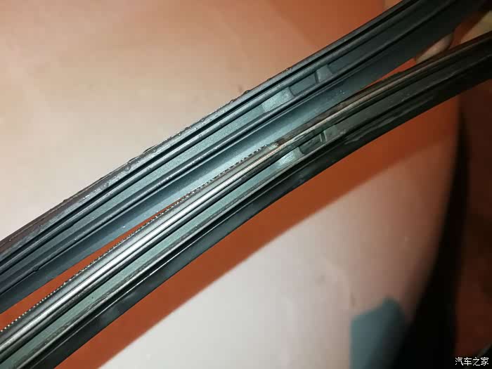 将胶条一段沿着捏住,稍微使点劲就能将原装胶条抽出。抽出来就能看到钢条,这个钢条影响胶条对挡风玻璃的贴合程度。注意,钢条取出来不要放混了,钢条从哪边取出来,方向怎么样,在装新胶条式就装到哪边上去,这样就能让钢条贴合面不发生改变。