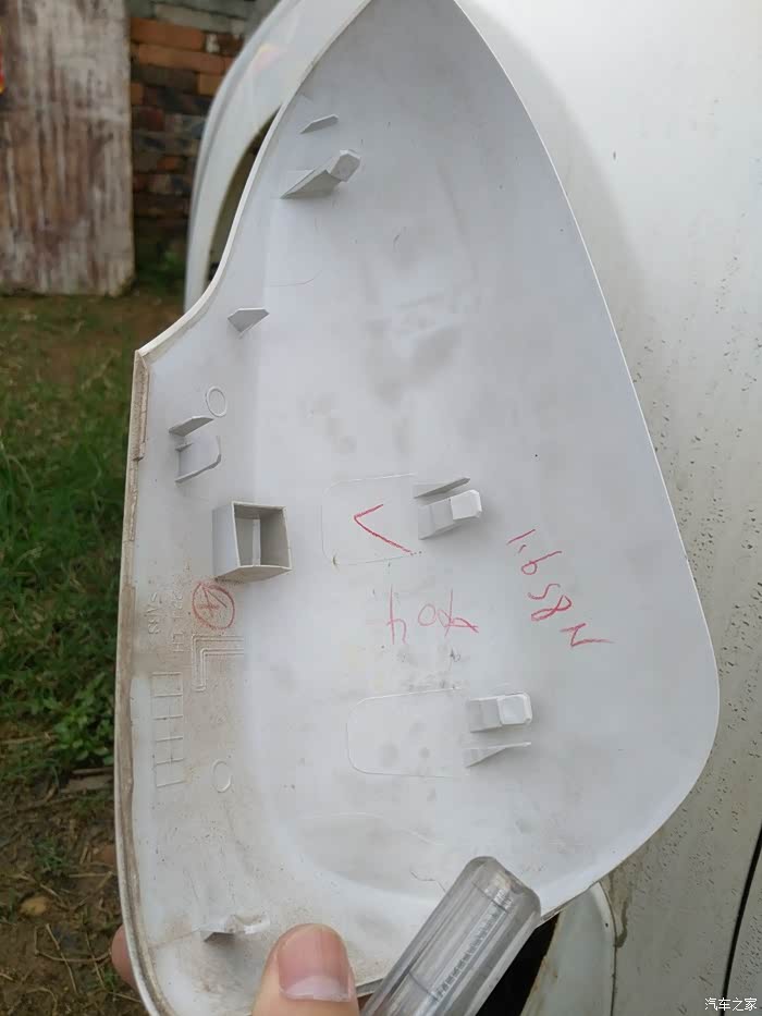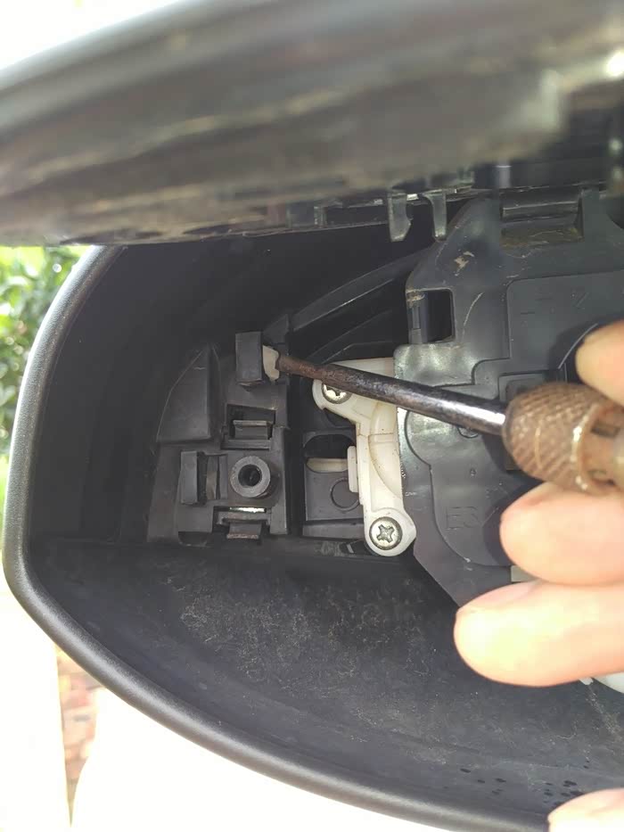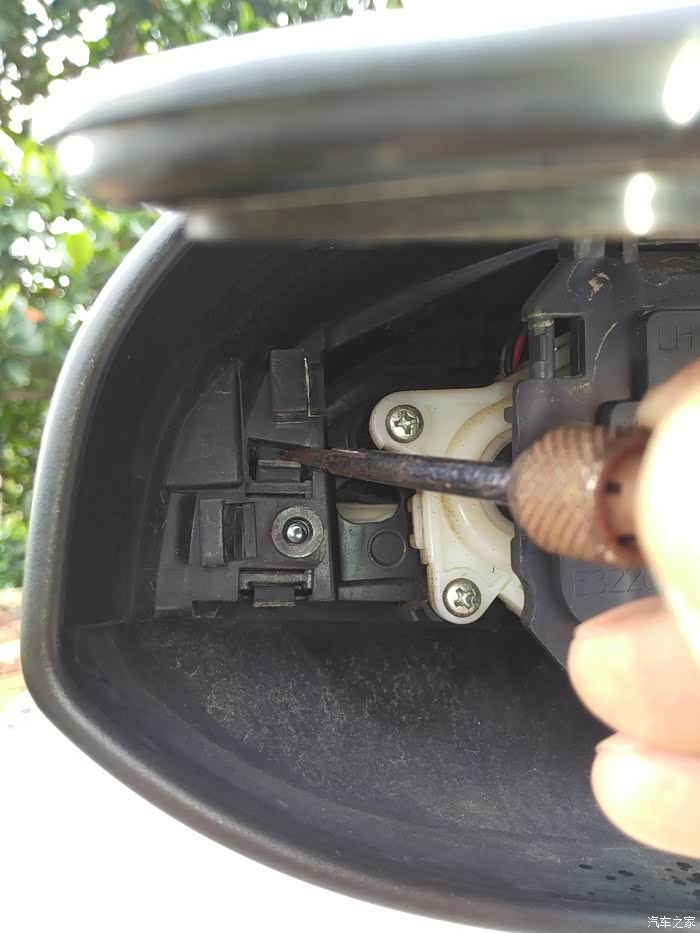 开始,镜子往上推最里面,然后用螺丝刀插进去,轻轻一撬就能撬起,不要大力,轻轻的就行