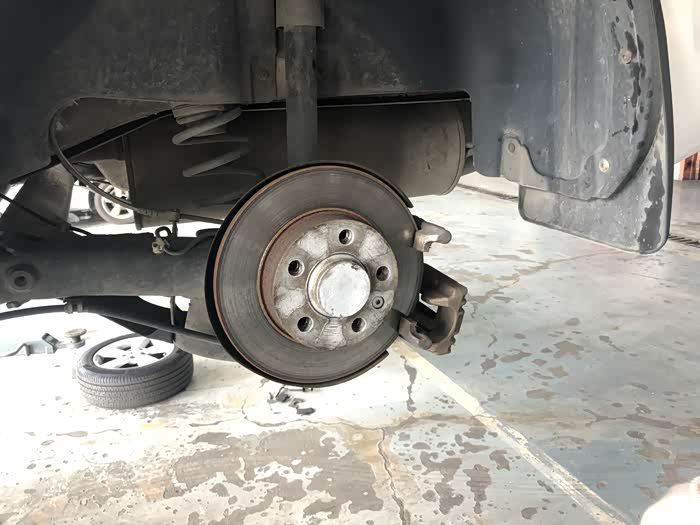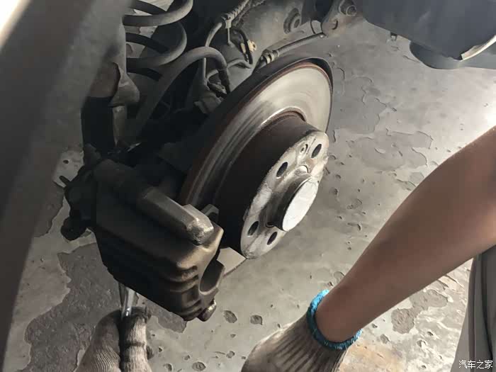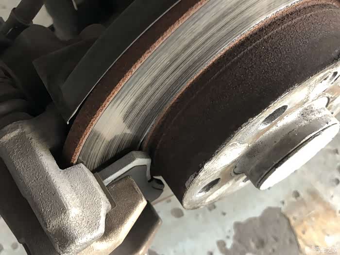 后盘刹的总成已经能看的很清楚了,就是右后轮的刹车片咬合太紧,刹车片损耗厉害。
