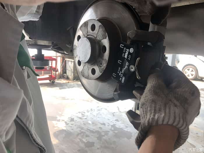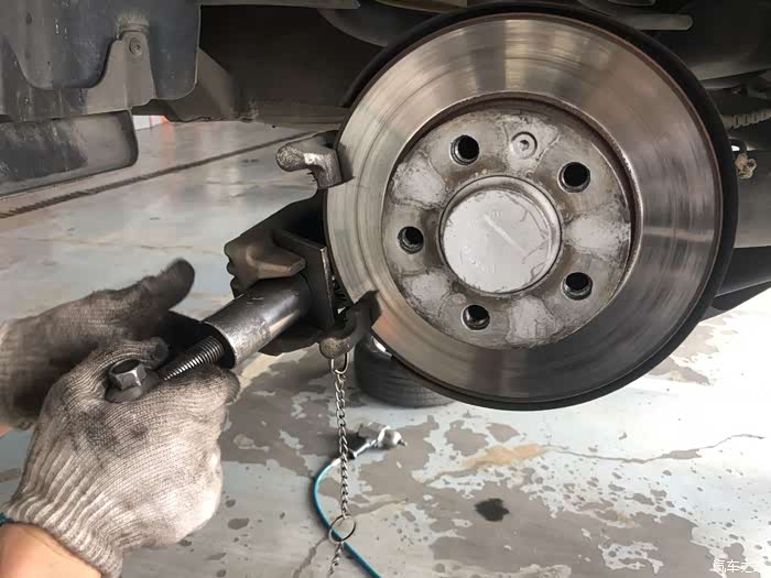 负责维修的师傅用分泵器在给我拆卸刹车片,一共4片全部换新的。