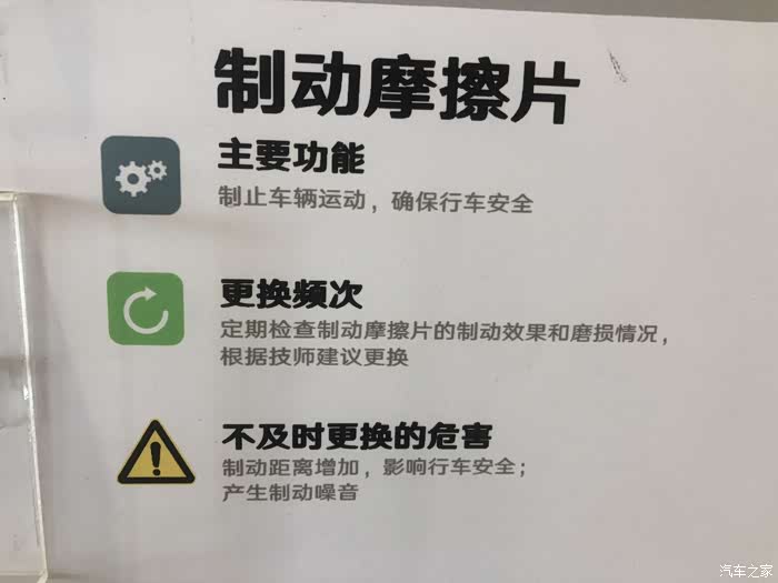 这是店里宣传刹车片使用的小贴士,车子开久了什么问题自己坐上去就能感觉到,只有按时保养车才会像新的一样,否则会减少爱车使用寿命。