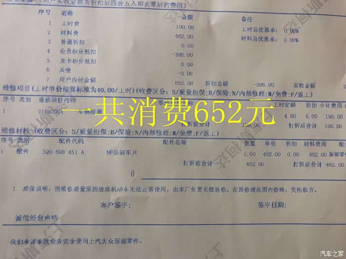 最后结算单出来了,连刹车片带工时费一共消费652元,没有折扣。