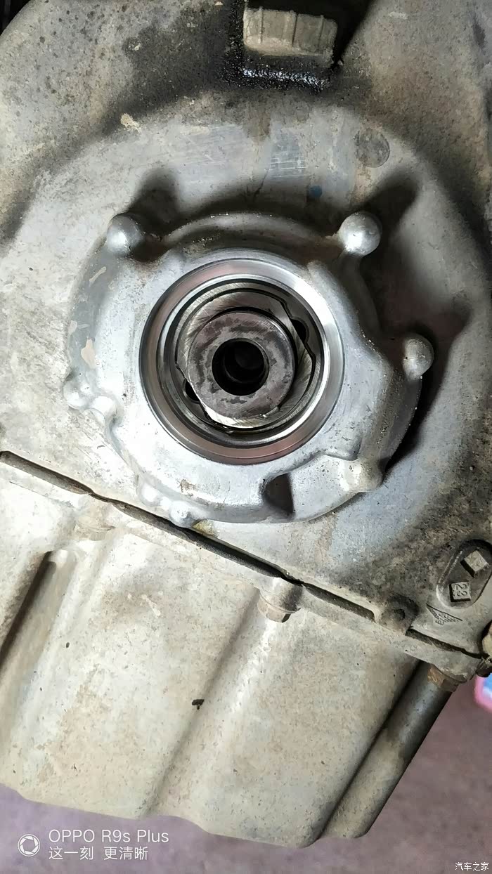 原装曲轴前密封圈,看起来还干净,发动机上面有甩出来机油。