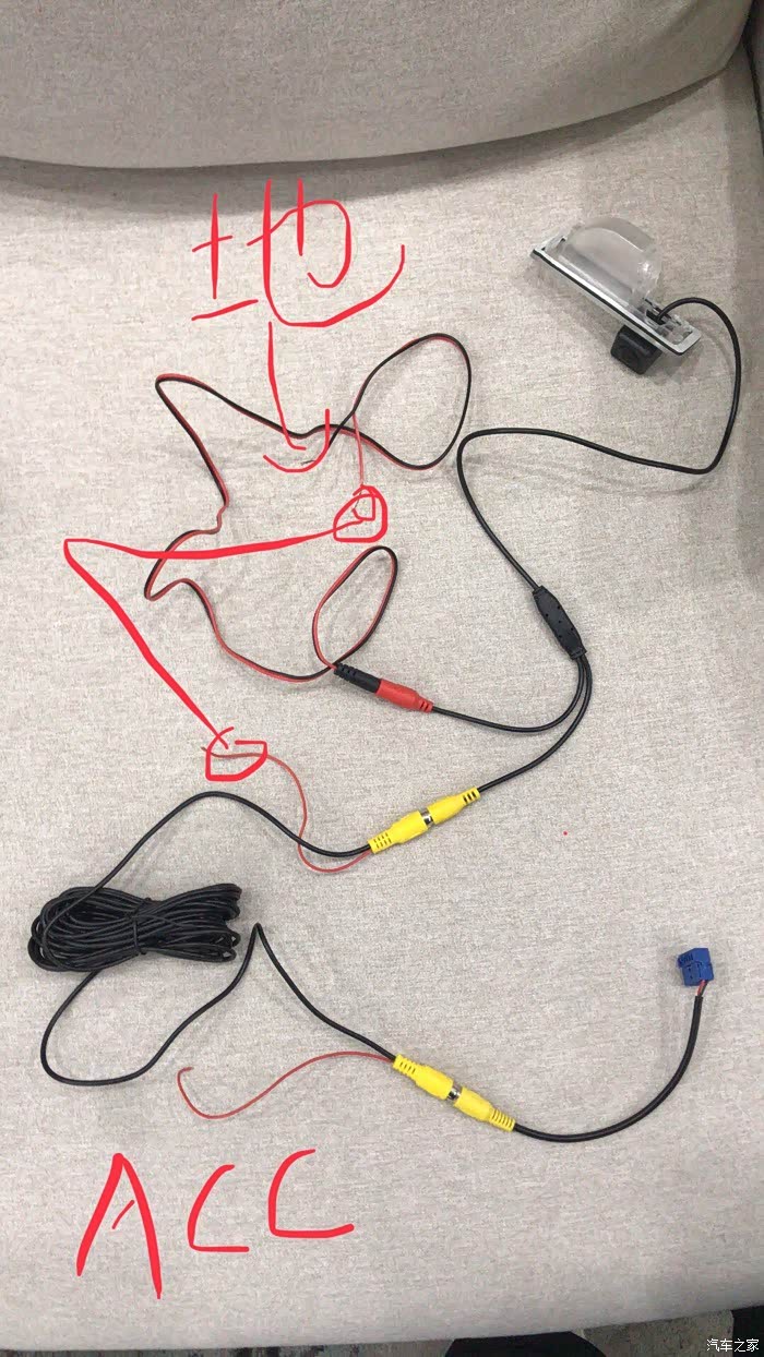这个其实很简单 蓝色插头是视频转接线连接摄像头到机头上 摄像头出来的两根红线接一起 是给摄像头供电的 标记ACC的是从保险丝ACC取电。