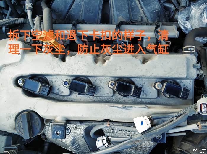 先退下火花塞电极的卡扣,方便清理一下灰尘,有条件的最好用吸尘机,我是用毛刷的。灰尘清理一下,避免拧掉高压包后灰尘沙子进到孔里面,造成不可用预估的故障。