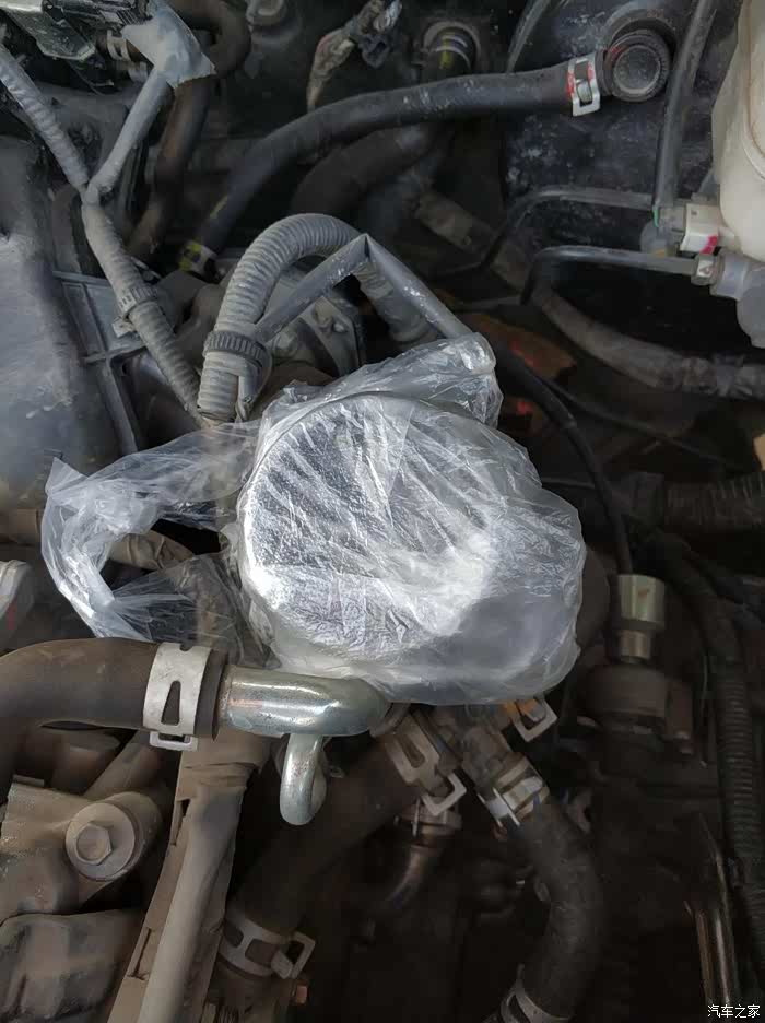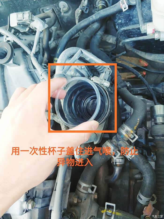 取下空气滤总成后,这个进气口需要保护一下,避免灰尘沙子进去,我用了一个一次性杯子和塑料袋盖住。