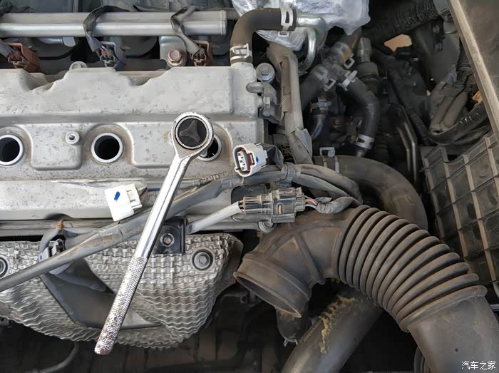 下面开始动手更换,用十字螺丝刀或者10mm的梅花扳手拧下空气滤总成两个固定螺丝,发动机右侧面还有一个喉管的卡箍也需要拧松。