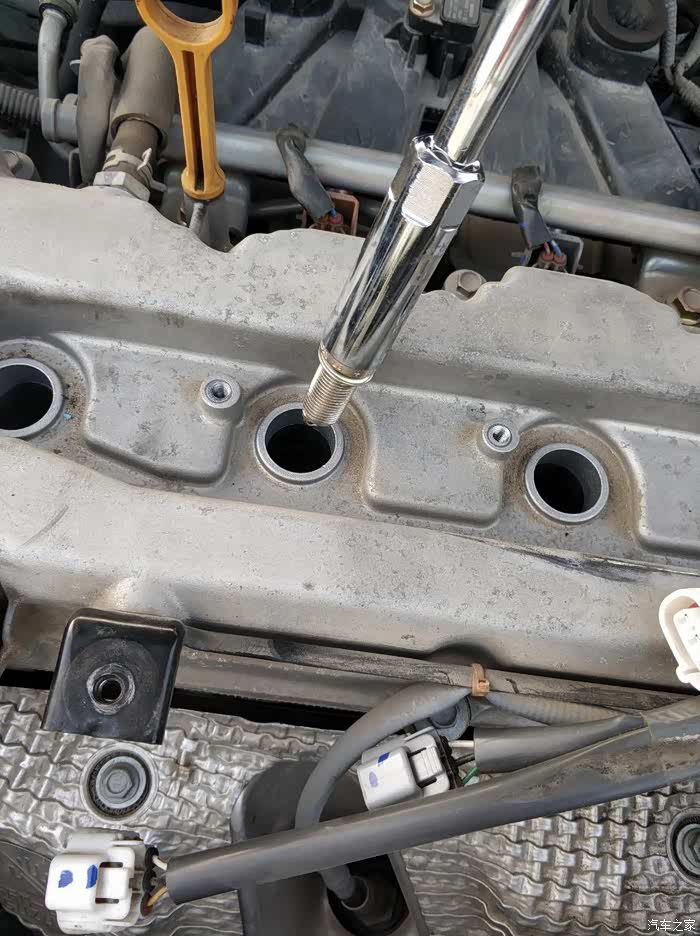 安装新火花塞的时候,记得用套筒吊下去(套筒内有橡胶孔可以夹住电极头的,有的是有磁铁的,看自己买的时候选择),千万不要自由落体丢下去,避免损坏螺丝牙。