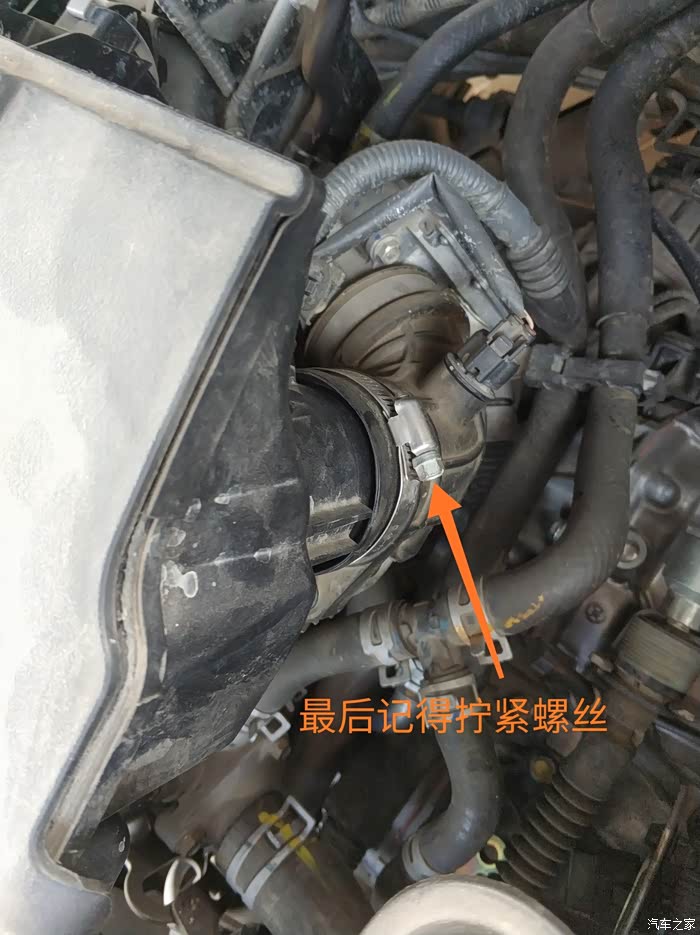 并且对准这个进气喉管,这个螺丝最后安装好才拧紧(记得拧紧,很多进厂保养的,都忘记拧这个卡箍,不过不拧问题也不算太大,这个塑料壳的强度也足够抗住吸气的压力,不过密封性就不敢保证了)。