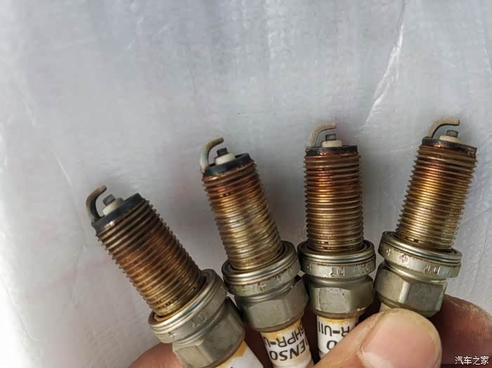 分别1-4缸换下来的火花塞电极,看上没有明显的电蚀伤和重积碳。估计还能用一段时间。