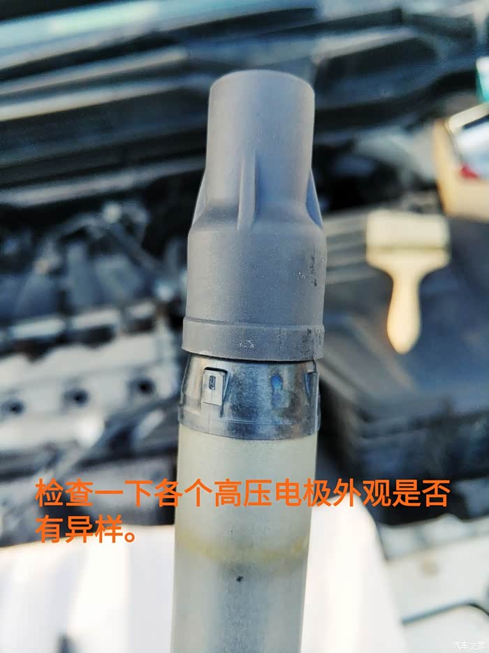 这个高压电极是当时去保养的时候车厂抽检的一支,估计没有清理干净就直接装了,裸露在缸头最上方的防尘橡胶帽子也没有按到位。所以去车厂保养必须也要监督一下。