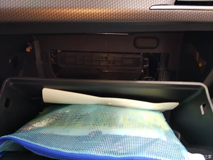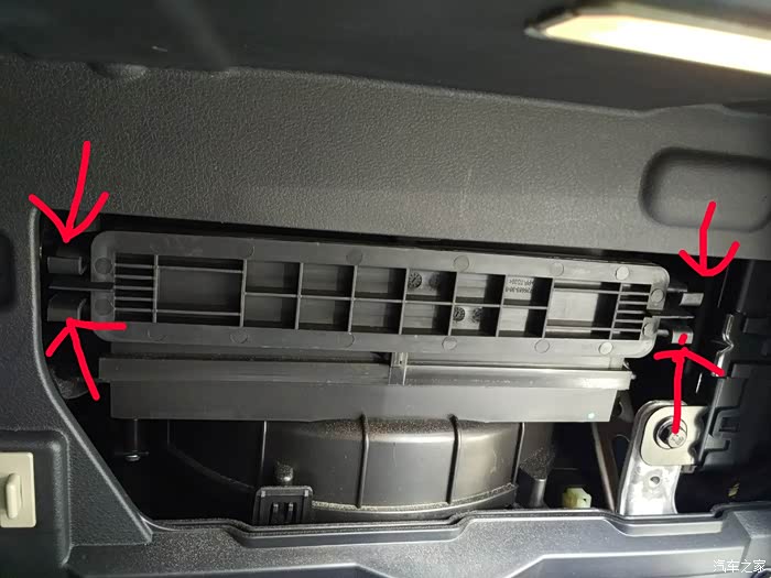 取下卡扣卡扣凹槽朝自己方向拉,取下左右2个卡扣(注意不要把手套箱打开到最大,不然不好取下来)
